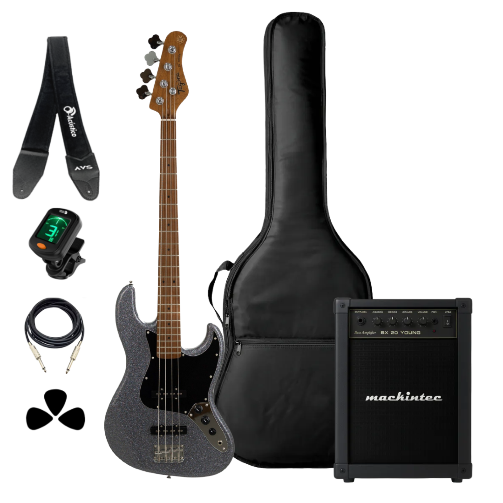 Para elevar sua performance, este kit inclui o Amplificador Mackintec BX-20. Com 20 Watts RMS, ele foi projetado para entregar clareza sonora em ambientes domésticos e ensaios. Sua interface intuitiva permite ajustes de equalização precisos, garantindo que o brilho e a definição característica do seu Tagima Jazz Bass sejam projetados com fidelidade.