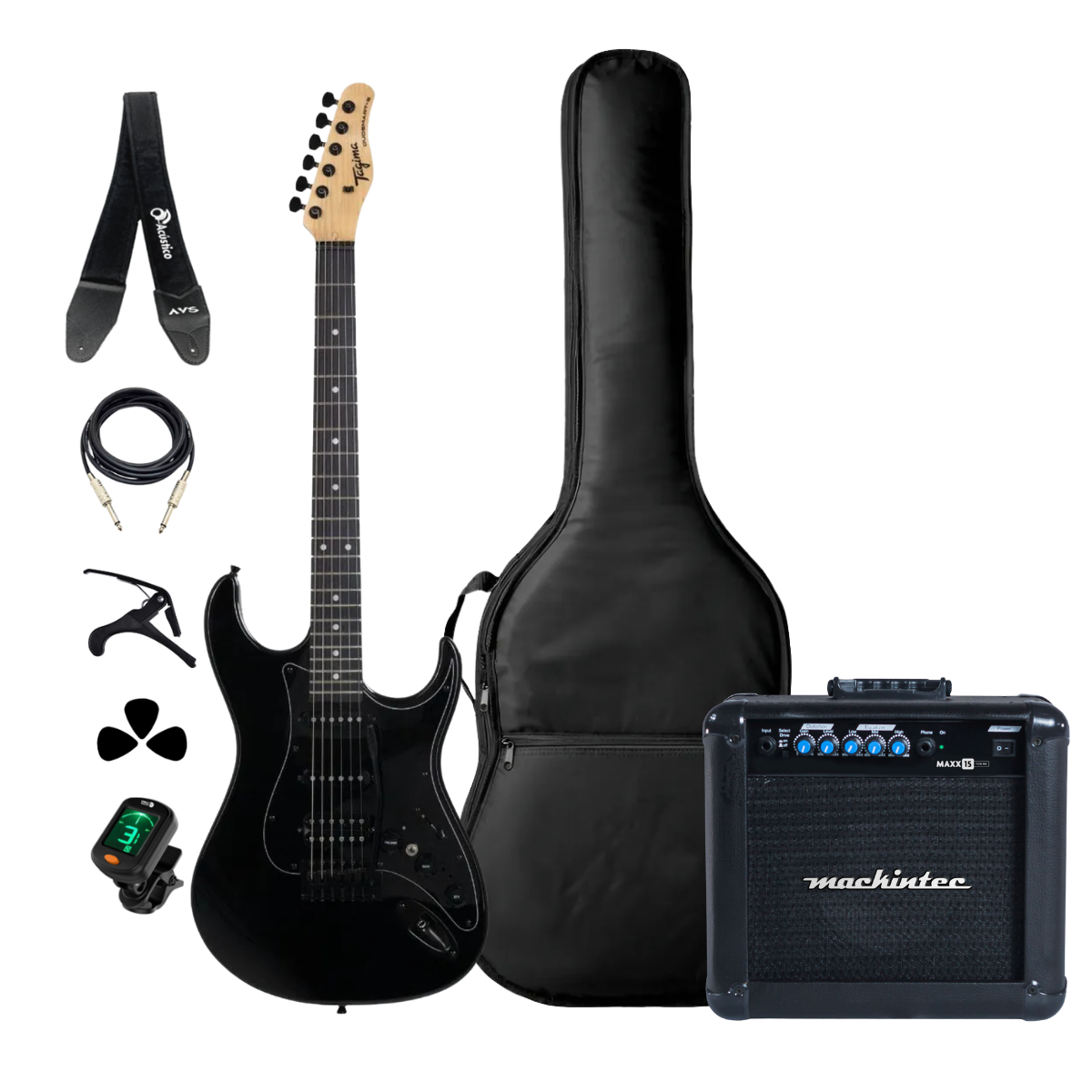 O Amplificador Mackintec Maxxx 15 completa este kit de forma ideal. Com 15W de potência e controles de equalização (Grave e Agudo), ele permite extrair toda a versatilidade das 5 posições da guitarra, sendo perfeito tanto para sons limpos e brilhantes quanto para overdrives encorpados em seus estudos e ensaios.